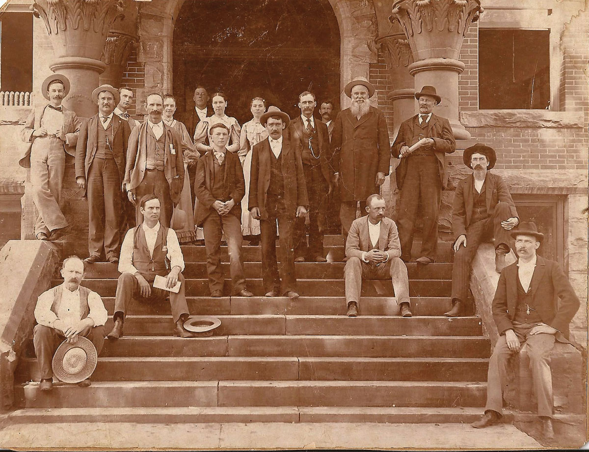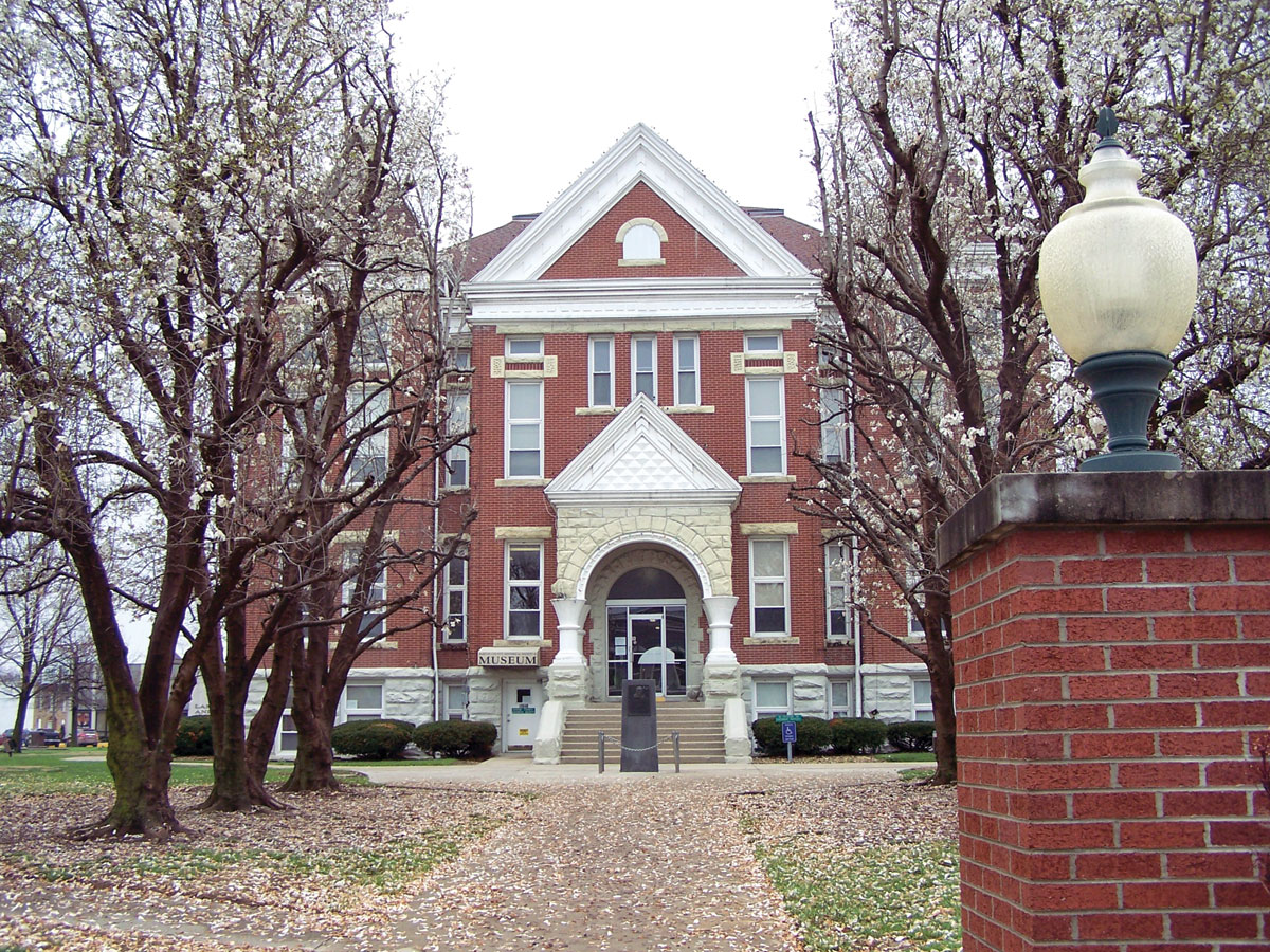 The original structure was replaced in 1860 by a two-story brick structure located in the center of the square. There were four rooms below with court rooms above. In 1863, most of the buildings on the square, including the courthouse, were burned by unidentified Civil War raiders. At that time, the courthouse records disappeared under circumstances which remain a matter of dispute. The most reliable report seems to be that Bill Wells, Bill Duke and John Goss, Confederate sympathizers, who lived southeast of Milford, a village in Barton County, removed the records and took them to the home of Wells’ father and buried them under a smoke house. After the war, Wells went to Arkansas where he located Edward G. Ward and told him the location of the records. The records, except Book A, were recovered.